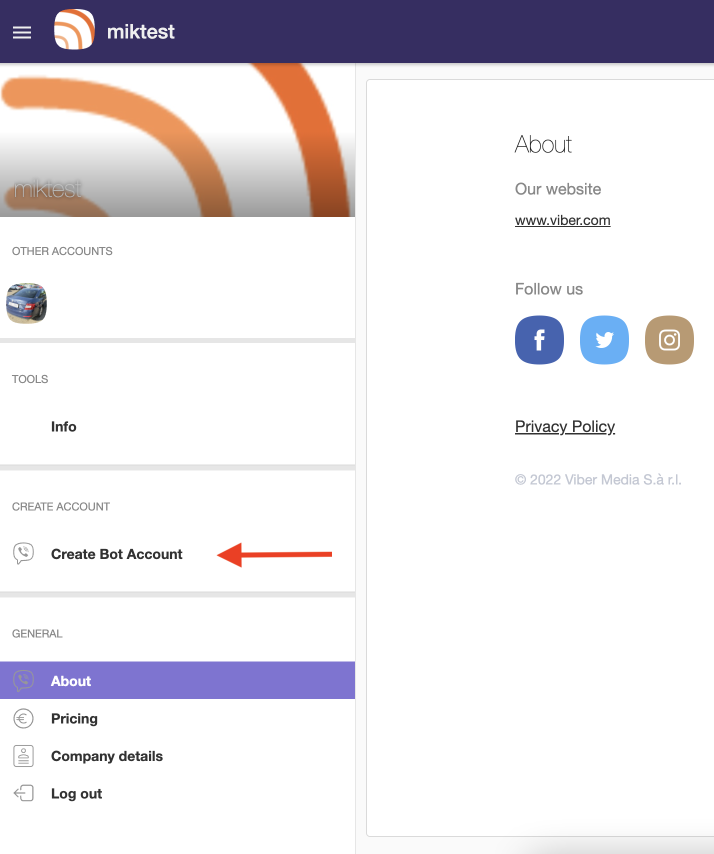 Vyplňte žádost o vytvoření Viber bota s ohledem na https://help.viber.com/hc/en-us/articles/15247629658525-Bot-commercial-model . Tým Viberu poté vaši žádost zkontroluje a zašle vám zpětnou vazbu; budete tak moci dokončit proces registrace.