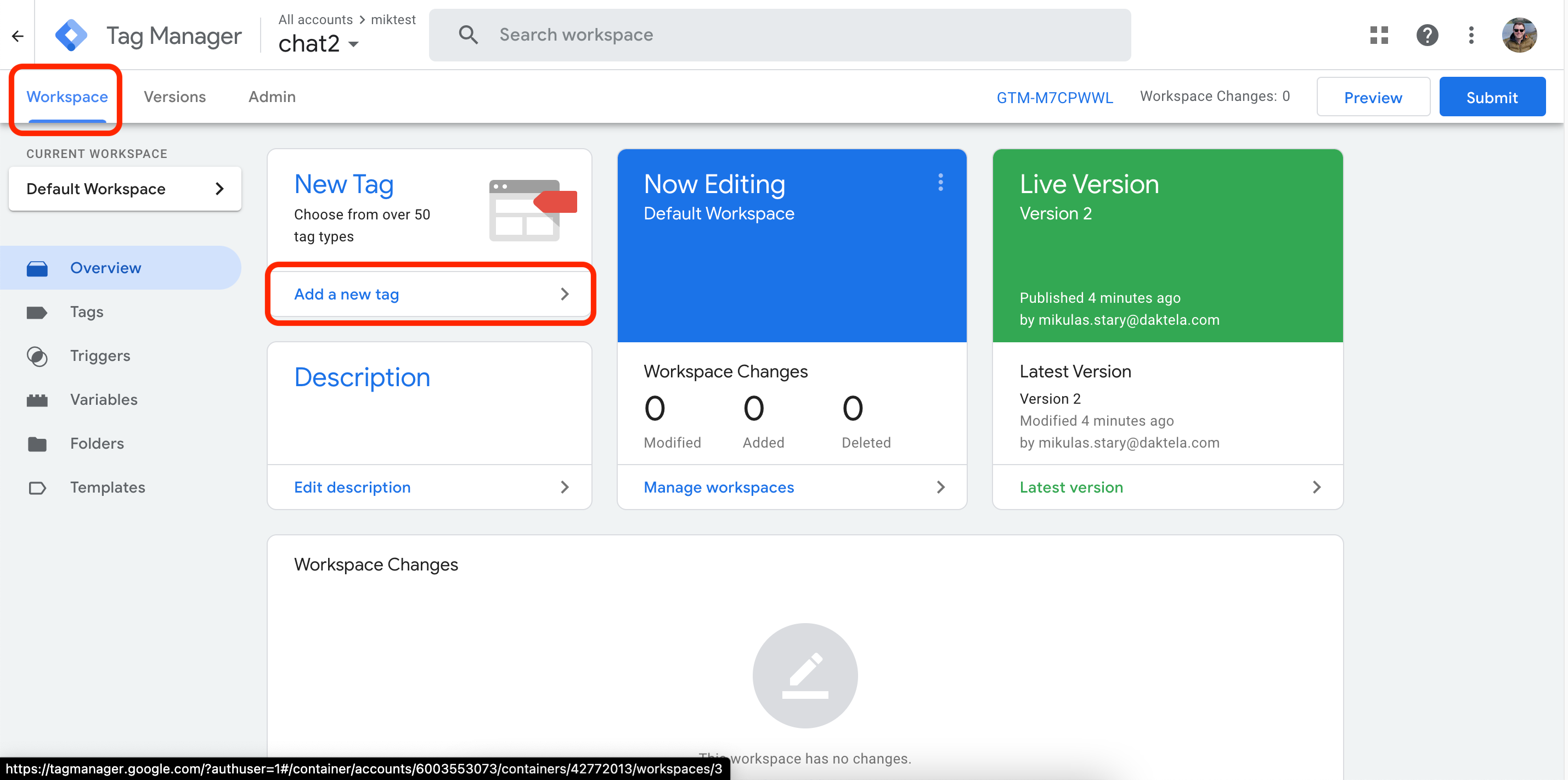 Přihlaste se do Správce značek Google, otevřete Pracovní prostor a klikněte na Přidat novou značku.