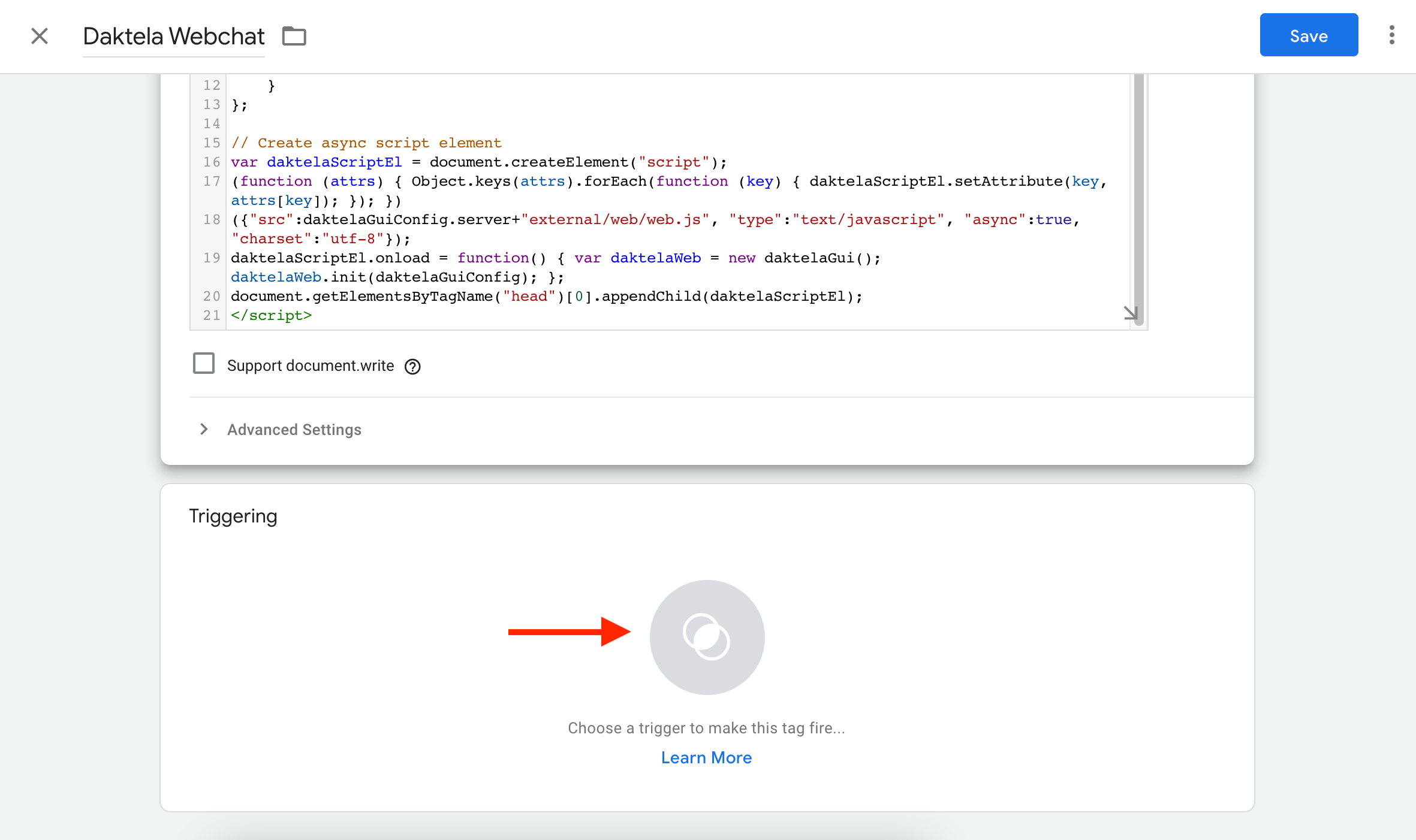 Při použití nového kódu získaného pomocí možnosti „Získat kód“ v nastavení směrování webchatu, nebo při úpravě staršího kódu tak, aby byla proměnná daktelaWeb
