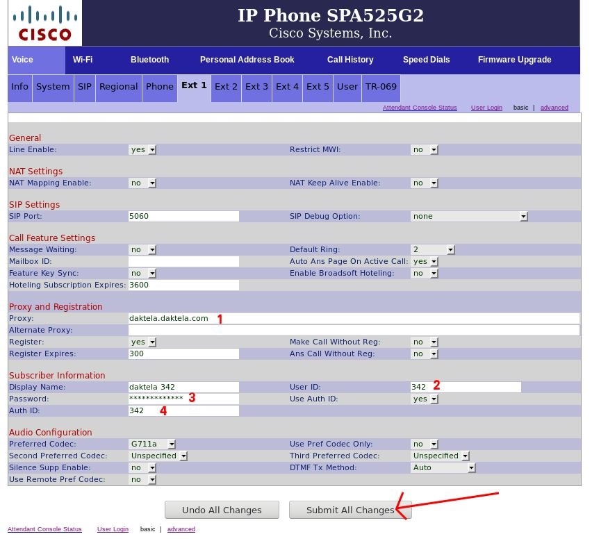 do pole User ID ( 2 ) a Auth ID ( 4 ) vyplníte číslo linky telefonu (viz. Nastavení ústředny)