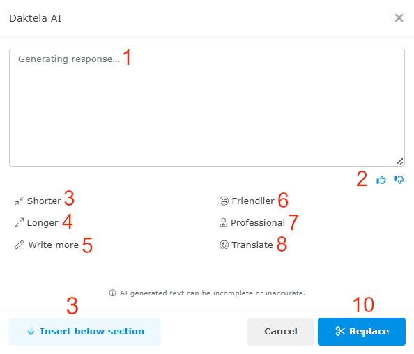 Při zvolení jakékoliv položky z rozbalovacího menu se vám otevře okno Daktela Copilot, kde se vám vygeneruje výsledek.