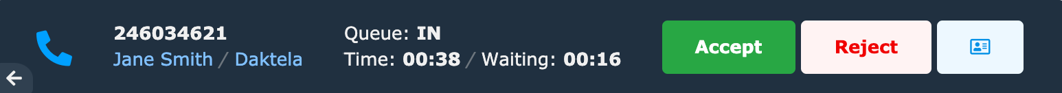 Pokud v pravém horním rohu vidíte ovládací tlačítka ihned poté, co se přihlásíte do Daktely, máte nastavené statické přihlášení a jste připojeni automaticky. Tento krok můžete přeskočit a přejít rovnou na Výběr front.