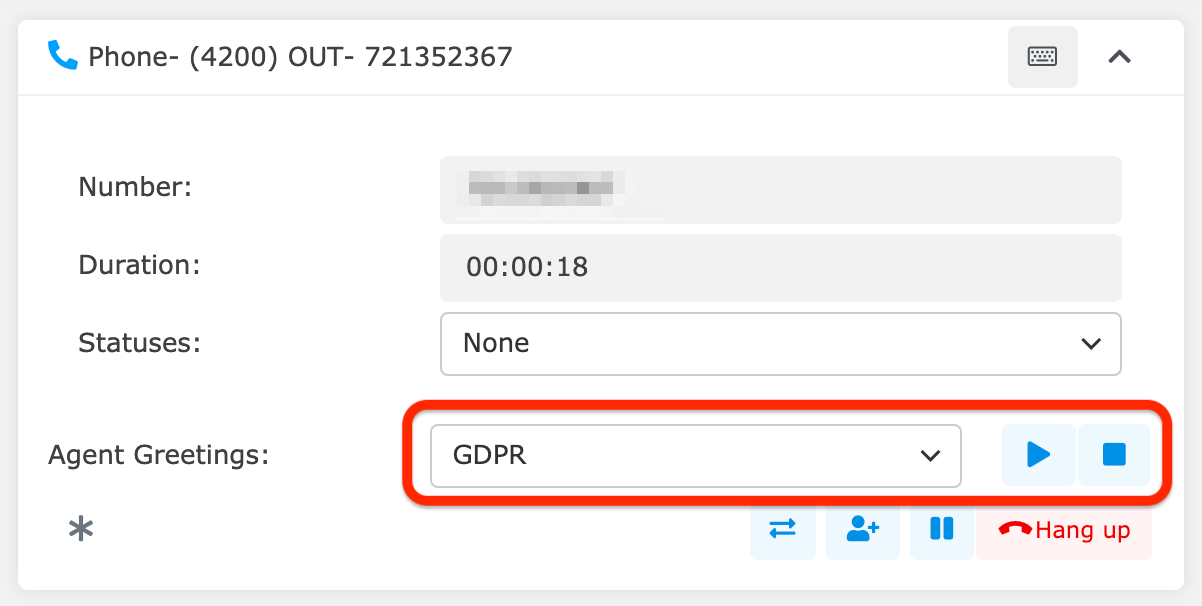 Ovládání přivítání se zobrazuje ve widgetu Telefon během hovorů. Z rozbalovacího seznamu vyberte, které přivítání chcete přehrát, a ovládejte ho pomocí tlačítek Play a Stop.