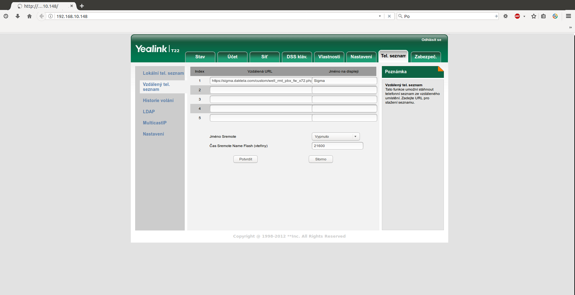 Jakmile budete přihlášení v rozhraní je nutné jít na kartu Tel. seznam a potom v levé straně na záložku Vzdálený tel. seznam.