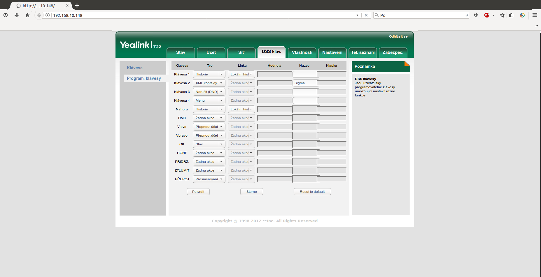 Dále pro vyvolání tohoto interního seznamu linek je nutné nastavit na telefonu programovatelné tlačítko, pomocí kterého budete do toho seznamu přistupovat. Je nutné jít na kartu DSS. kláv a záložku Programovatelné klávesy. Zde například využít klávesu č. 2, kde je původně nastavený lokální adresář. Rozklikněte roletkové menu a vyberte typ XML kontakty. Dále je nutné pojmenovat tlačítko shortcutem dle uvážení. Viz Obrázek 4.