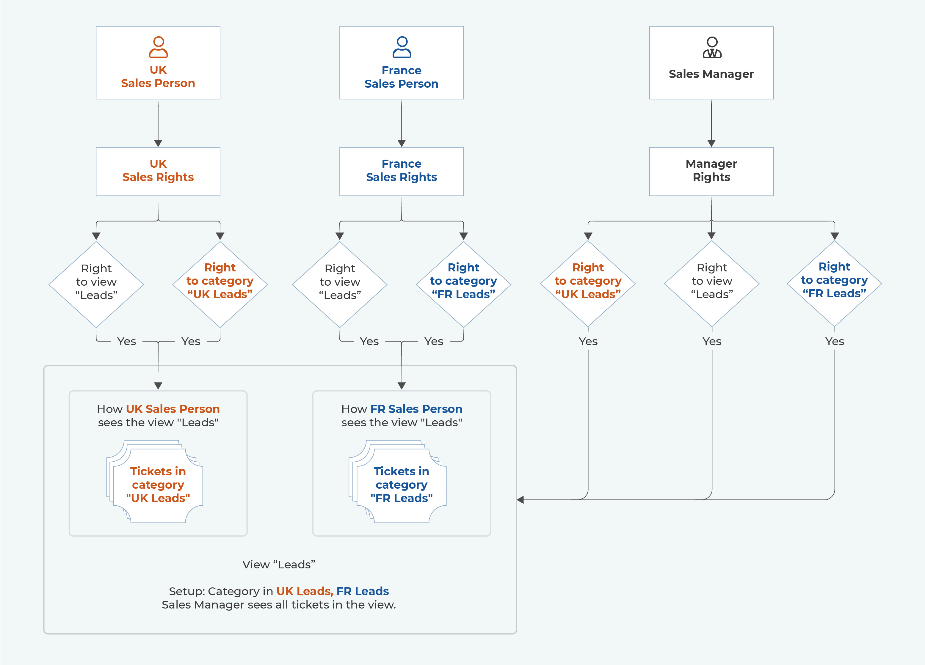 Pohled mohou otevřít všichni uživatelé, kteří na něj mají právo. Aby však viděli tickety v něm obsažené, musí i tak mít právo na jejich kategorie. To znamená, že různí uživatelé mohou v tomtéž pohledu vidět různé tickety.