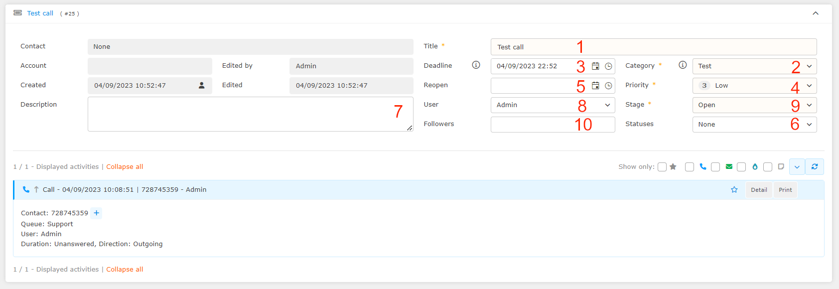 If the customer's phone number is not saved in the CRM module, the Contact widget will be open on the Activities tab.