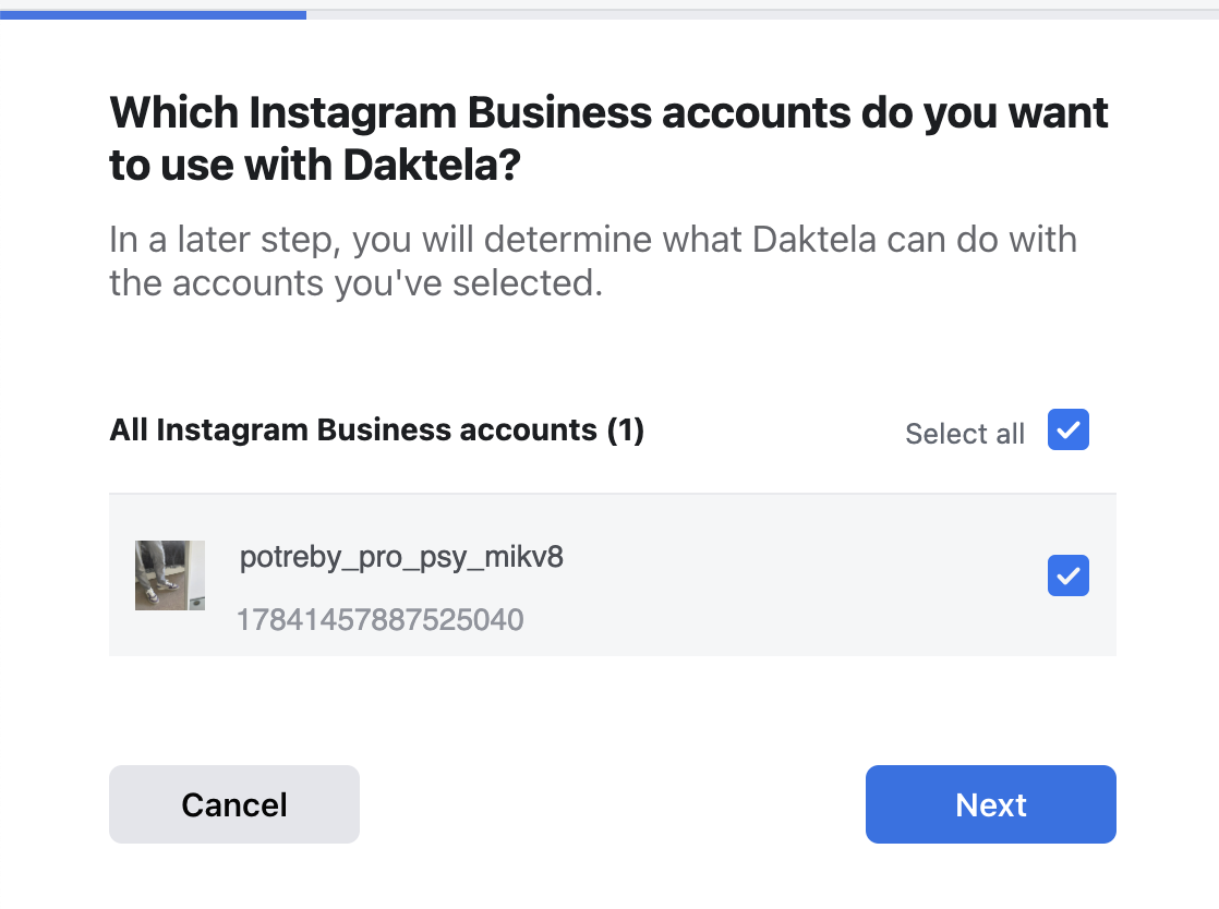 Now that your account is ready an linked, set up the Connector in Daktela. You will need to authorise the Facebook page that you have previously connected with your Instagram Business account.