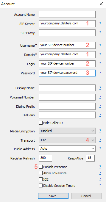 SIP Server and Domain: enter the hostname of your Daktela instance – usually the same as the address you use to log in to Daktela, e.g. "yourcompany.http://daktela.com ".