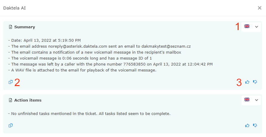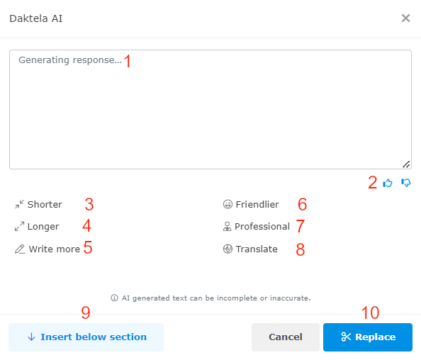 When you select any item from the dropdown menu the Daktela AI window will open, where the result will be generated.