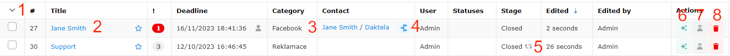 Waiting – a reply has been sent to the customer, waiting for their reaction. You can set a reopen date (6).