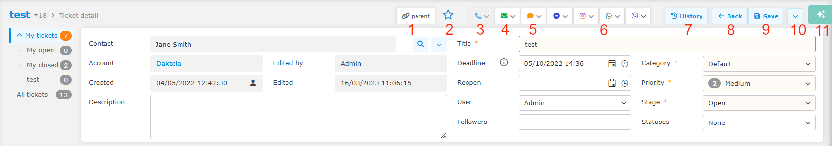 Closed – the ticket has been solved. You can set a reopen date (6). If the customer replies, the ticket will be set to Open again.