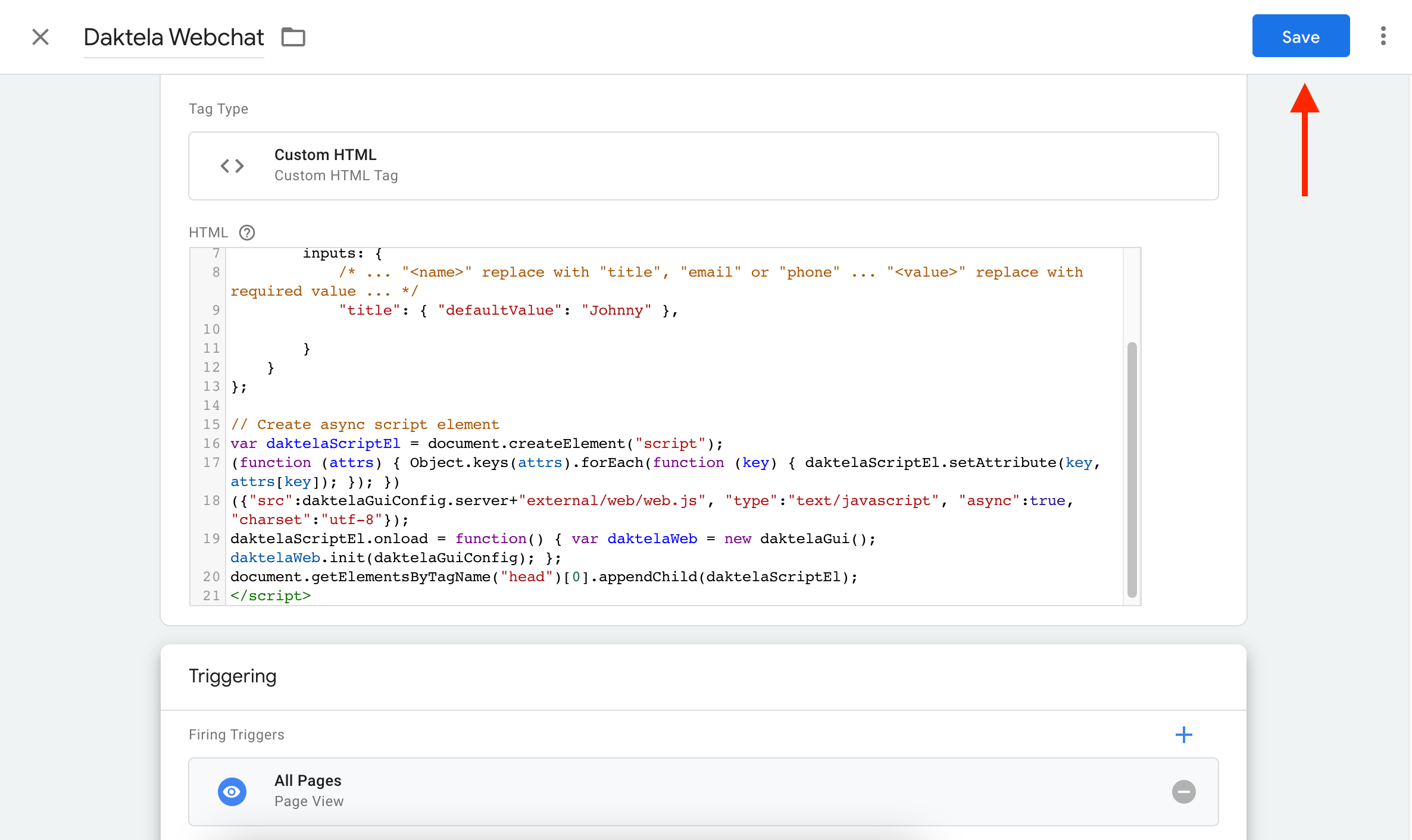 Paste the web chat code from Daktela into the HTML field.